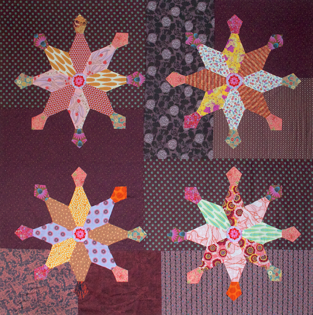 This quilt is now finished, and off to be quilted by my friend Shelly, as I am still without my long arm... I used only the Stretch Hex template here... and made the entire quilt out of my scrap bins. Yes it is wide, Y seams, and actually, goes to gather quite quickly, one you get your groove on. ( it each the tricks... don't be Scared! I then hand appliquéd it down on that fabulous yellow background... Mmmmmm, it sure looks good. I can't wait to snuggle up under it. it took my 12 hours alone to hand appliqué it to the background... you could just cut it and square it up... but I love the crazy shapes...