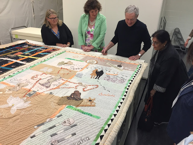Geeta Kandlewhal is also in the board with us, and it was inspiring to hear her talk about this quilt she made on the Ghandi. She is n amazing quilt Artist and collector from Mumbai, India. Greta is the author of Godharis of Maharashtra. She told a very moving story about this quilt.