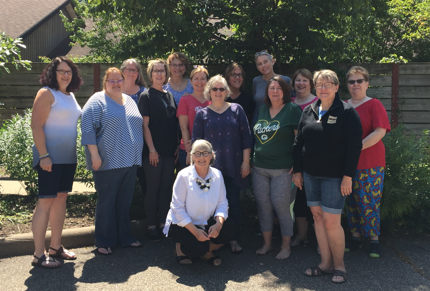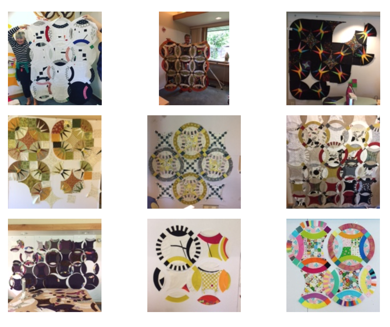 We (Beatrice and I and 12 fabulous quilters) had a load of fun at Woodland Ridge Retreat center, in Menominee, WI! Five glorious days of cutting and throwing fabric around, making Double Wedding Ring Quilts!