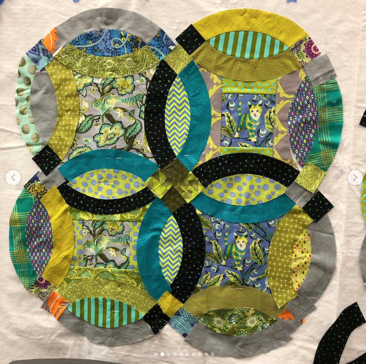 Contrast and finding elements within the design! I love that we could ficus hers with eh dark pattern among busy prints, to have a new design element come forward. We also incorporated a bit of orange to get people to look around at different elements within her quilt.
