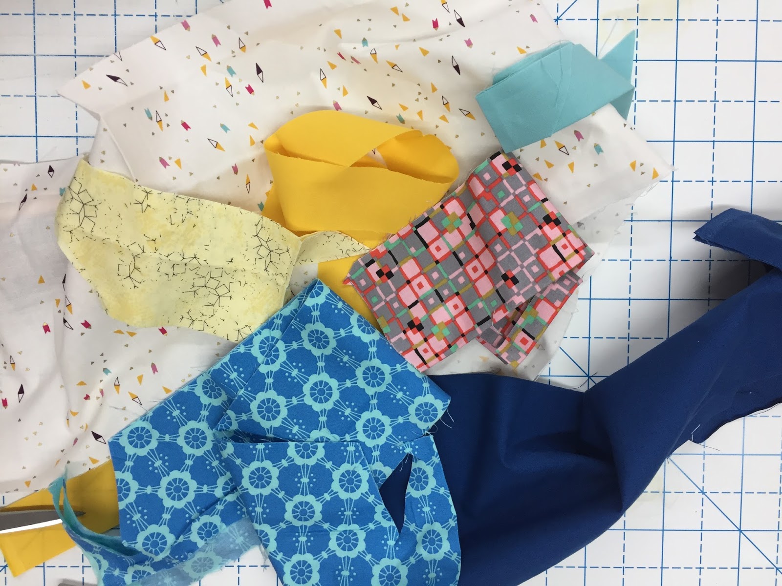 I'm continuing to make my scrap Yellow Pink and Blue Victory Block quilt. As I get a new pile of scraps, I cut parts out and leave them stacked up, then when I have free minute to play, I put together one more new block. Only thinking about designing the block to be different then the last one I made.