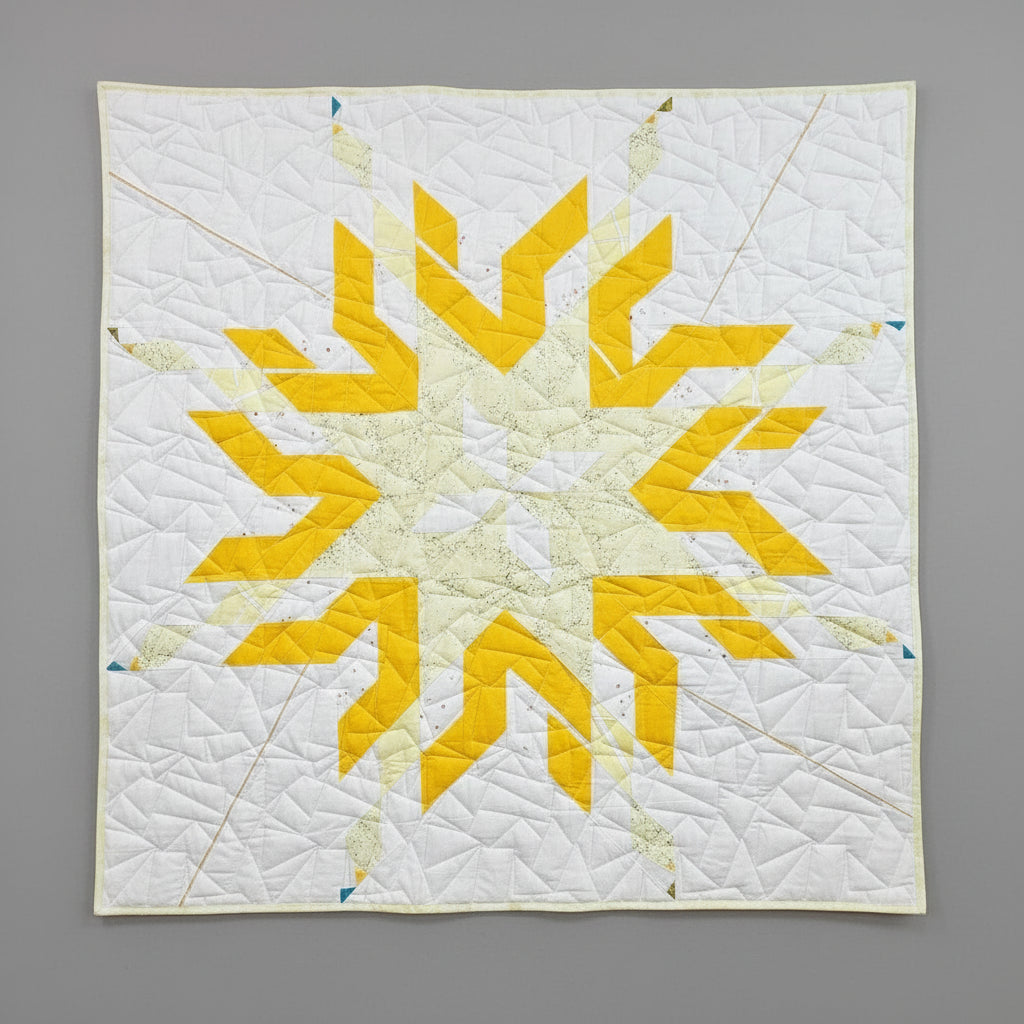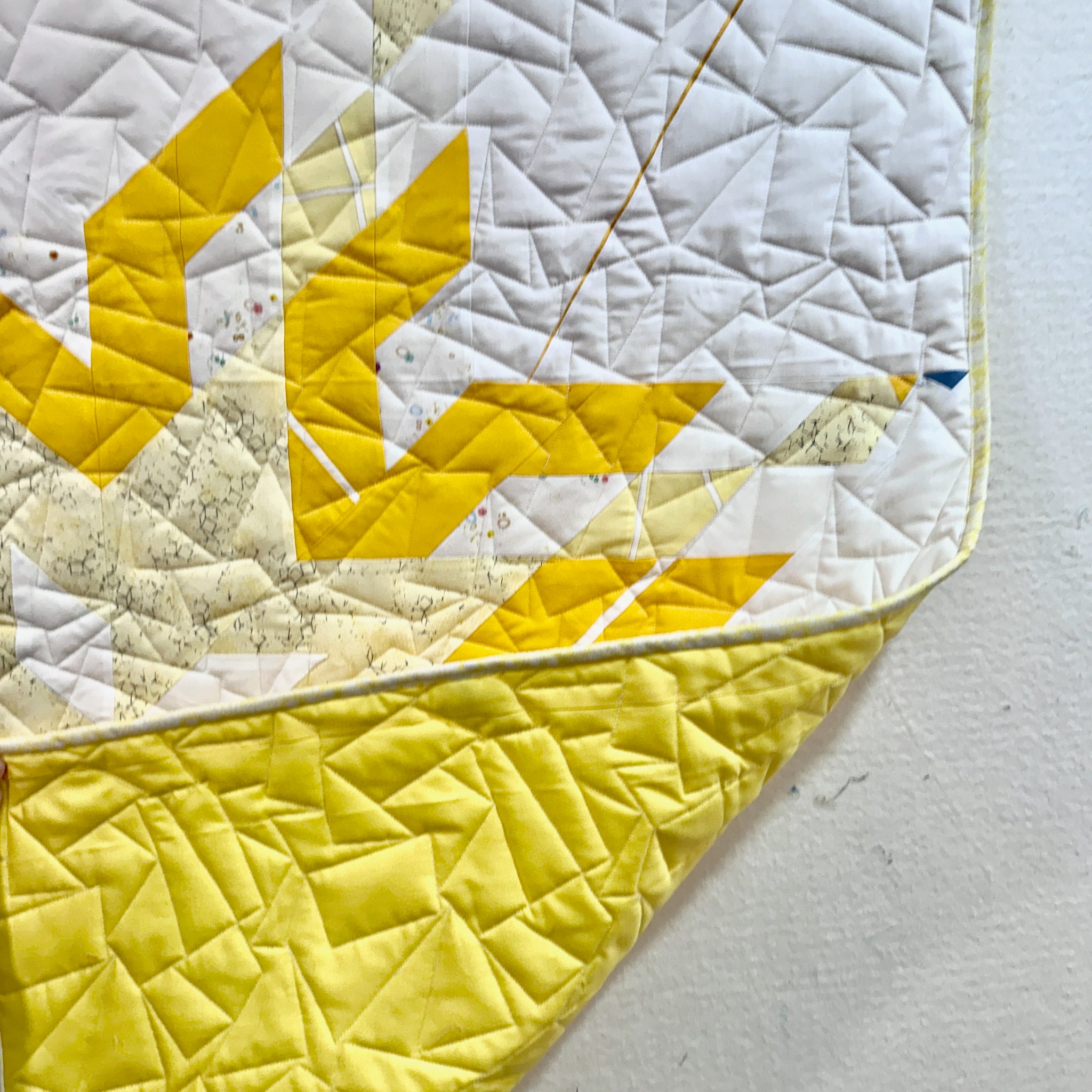 Size: 40" X 40" small improv swirling pieced star quilt in yellows and white. made as a class sample. Quilted by Julie Hirt. machined binding. Quilts & quilt tops are...